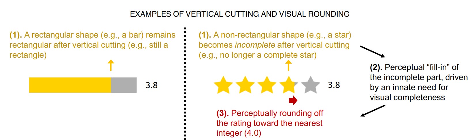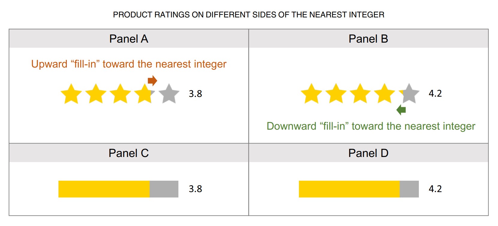 For example, when a star is vertically cut, consumers tend to mentally restore the missing part, leading to a rounding of decimal ratings. It can be a rounding-up or rounding-down effect showcasing a meticulous interplay between visual format, rating position, and consumer perception. Understanding this mental process presents the opportunity to not only observe but strategically present ratings on your website for optimal impact (Fig. 3).
