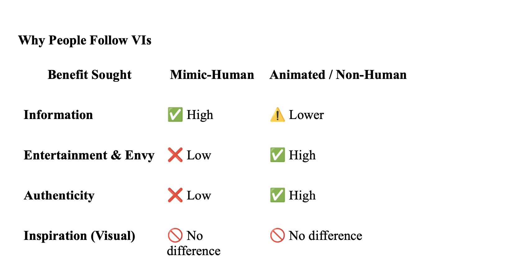 - Entertainment & Envy: Low for mimic-human VIs, high for animated/non-human VIs.